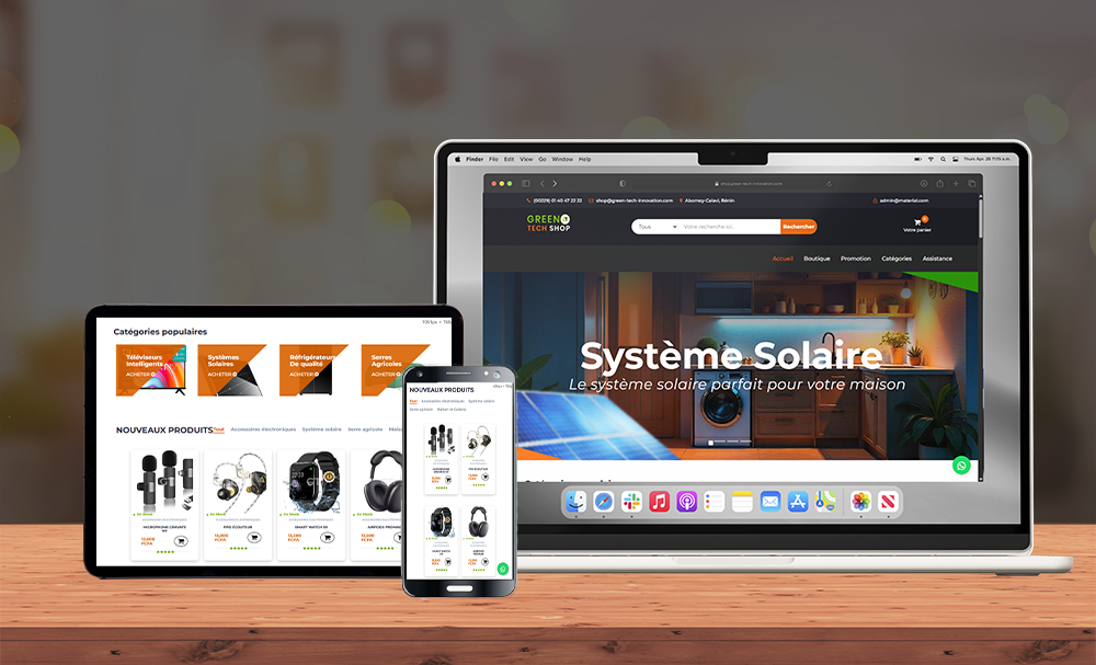 Voir PlusSolution digitale développée pour faciliter la vente en ligne des produits et équipements proposés par Green Tech Innovation. Cette plateforme permet aux clients d’explorer facilement les différentes catégories (énergie solaire, électroménager, équipements agricoles, etc.), de passer commande en toute sécurité et de bénéficier d’un service client rapide et efficace. Elle renforce la présence de l’entreprise sur le marché numérique tout en améliorant l’expérience d’achat des utilisateurs.