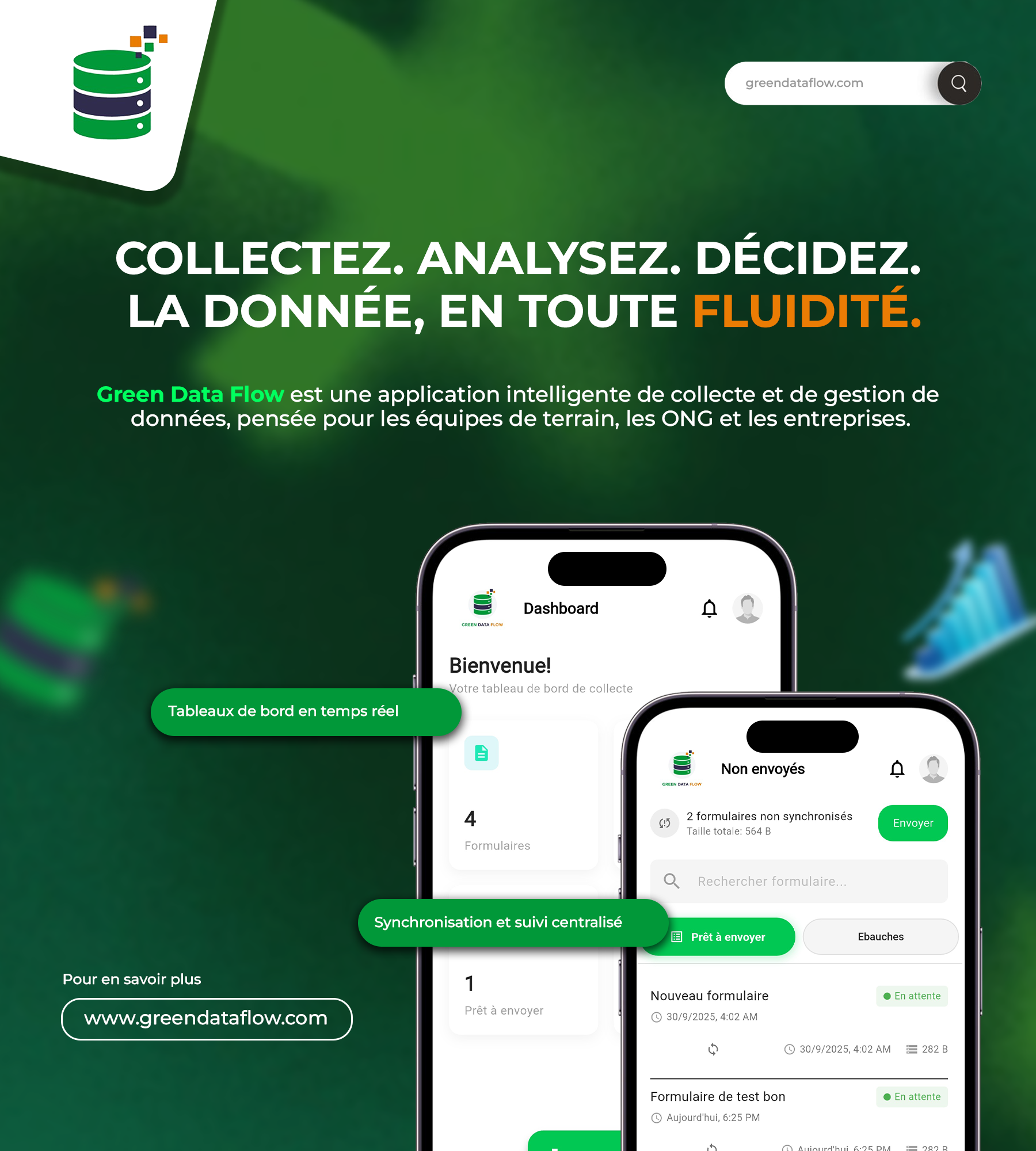 Voir PlusGreenDataFlow est une plateforme numérique de collecte, gestion et visualisation de données destinée à maximiser l’impact social des projets. GreenDataFlow Elle permet notamment : La création de formulaires personnalisés pour la collecte de données, avec une interface glisser-déposer, des templates prêts à l’emploi, et des validations en temps réel. GreenDataFlow La collecte de données sur le terrain, même hors connexion (offline), avec synchronisation manuelle une fois la connectivité rétablie. GreenDataFlow L’analyse en temps réel, des rapports personnalisés, et des visualisations (dashboards) pour suivre les indicateurs. GreenDataFlow La gestion de projets et d’équipes : permissions, rôles, workflows personnalisés, collaboration. GreenDataFlow La sécurité avancée : chiffrement de bout en bout, conformité au GDPR, sauvegardes automatiques, contrôle d’accès granulaire, etc. GreenDataFlow ⚙️ Usages possibles Cette solution peut être utilisée dans plusieurs contextes, notamment : Suivi & évaluation (M&E) de programmes de développement (agriculture, santé, éducation, etc.). Collecte de données terrain pour études de filières (aquacole, avicole, etc.). Gestion des interventions ou projets multi-sites / multi-pays avec des équipes sur le terrain. Rapports et tableaux de bord pour rendre compte aux bailleurs ou partenaires. Renforcement des capacités locales dans la collecte de données fiables. 💡 Forces Adaptée aux environnements avec connectivité limitée (offline). Interface intuitive, ce qui facilite la formation des agents de terrain. Sécurité élevée des données et compliance (données sensibles, respect de la vie privée). Rapidité de déploiement : capacité de mise en œuvre en peu de temps. Fonctions de collaboration d’équipe utiles pour la gestion de projets complexes.